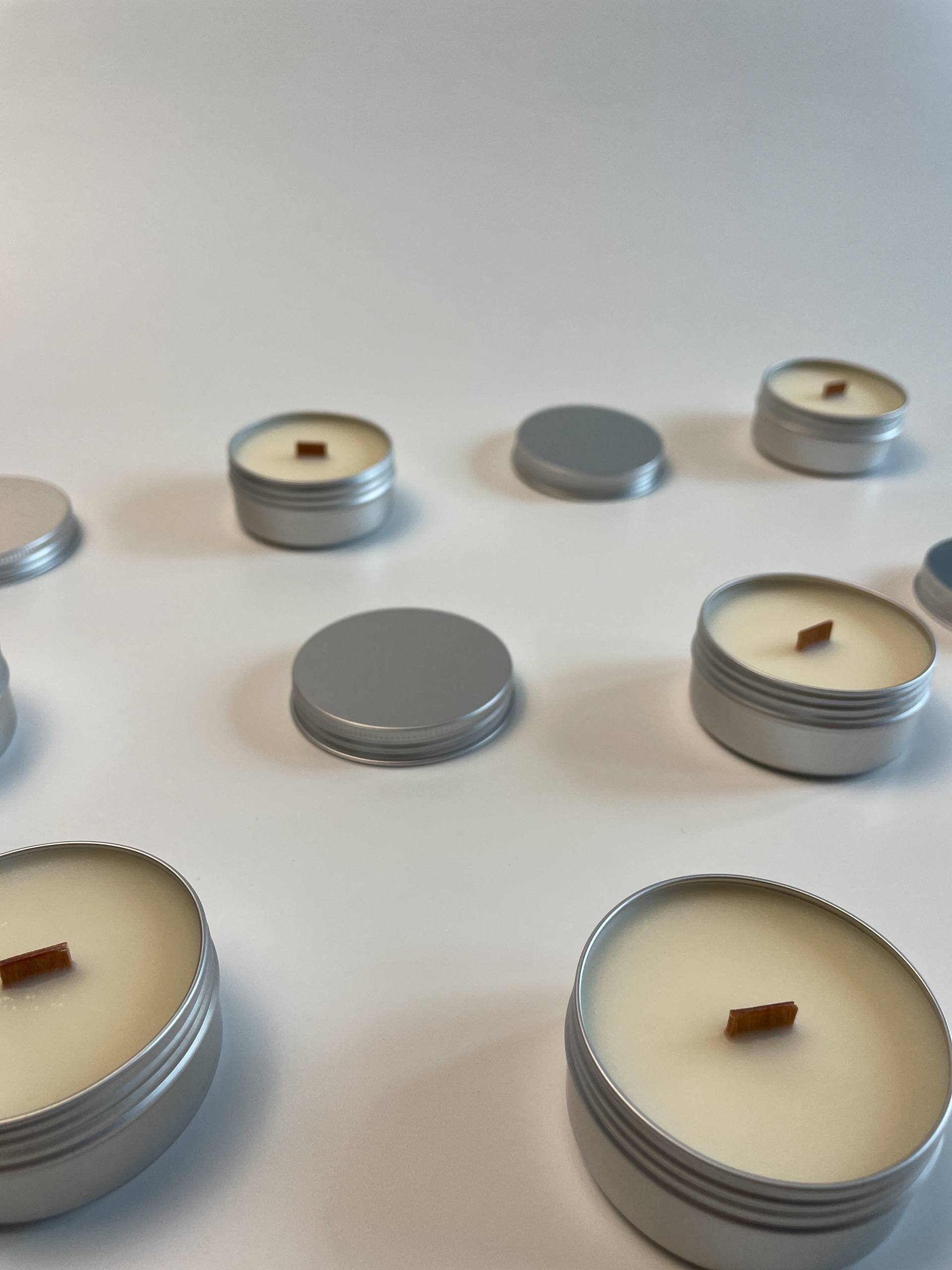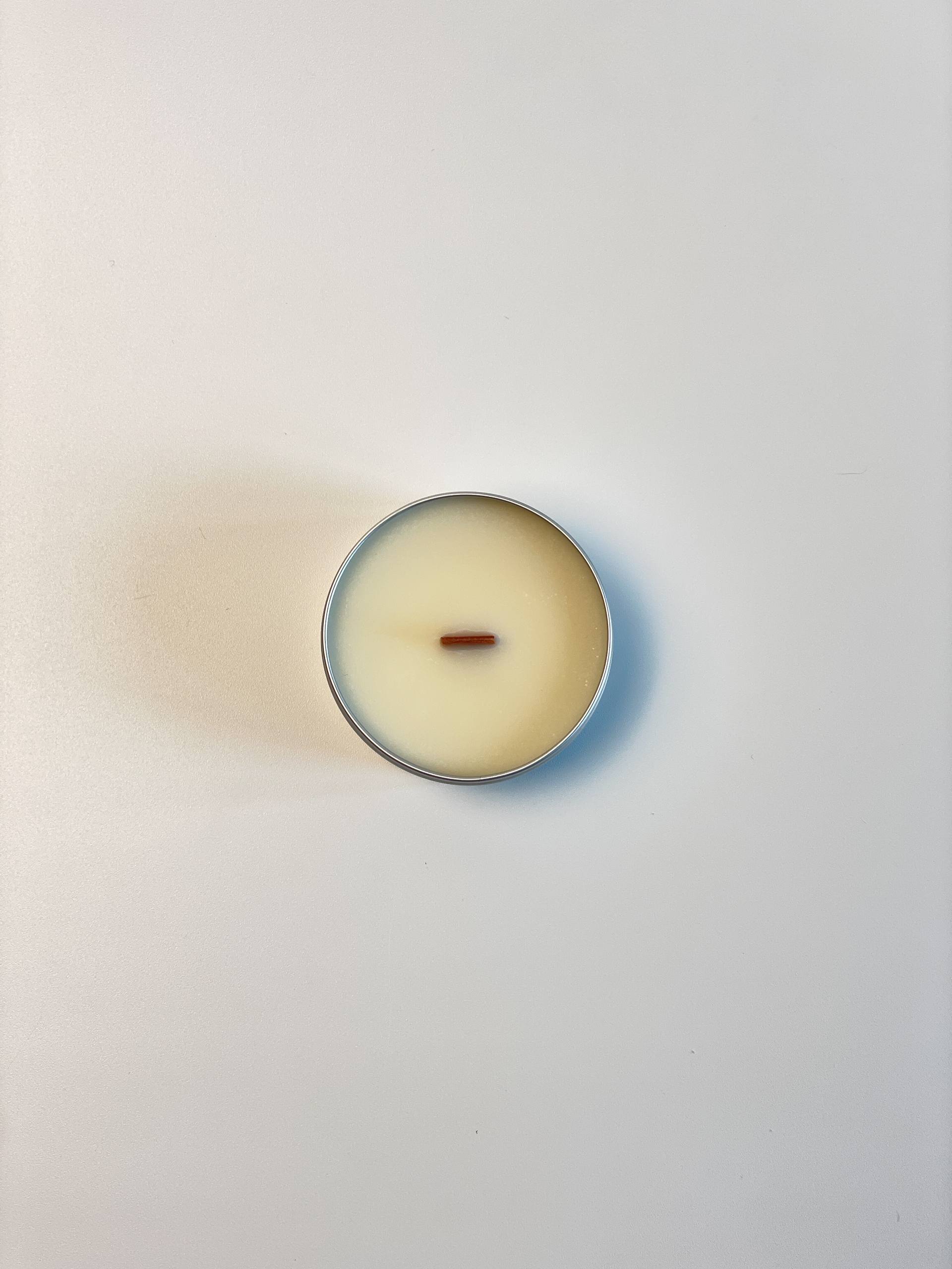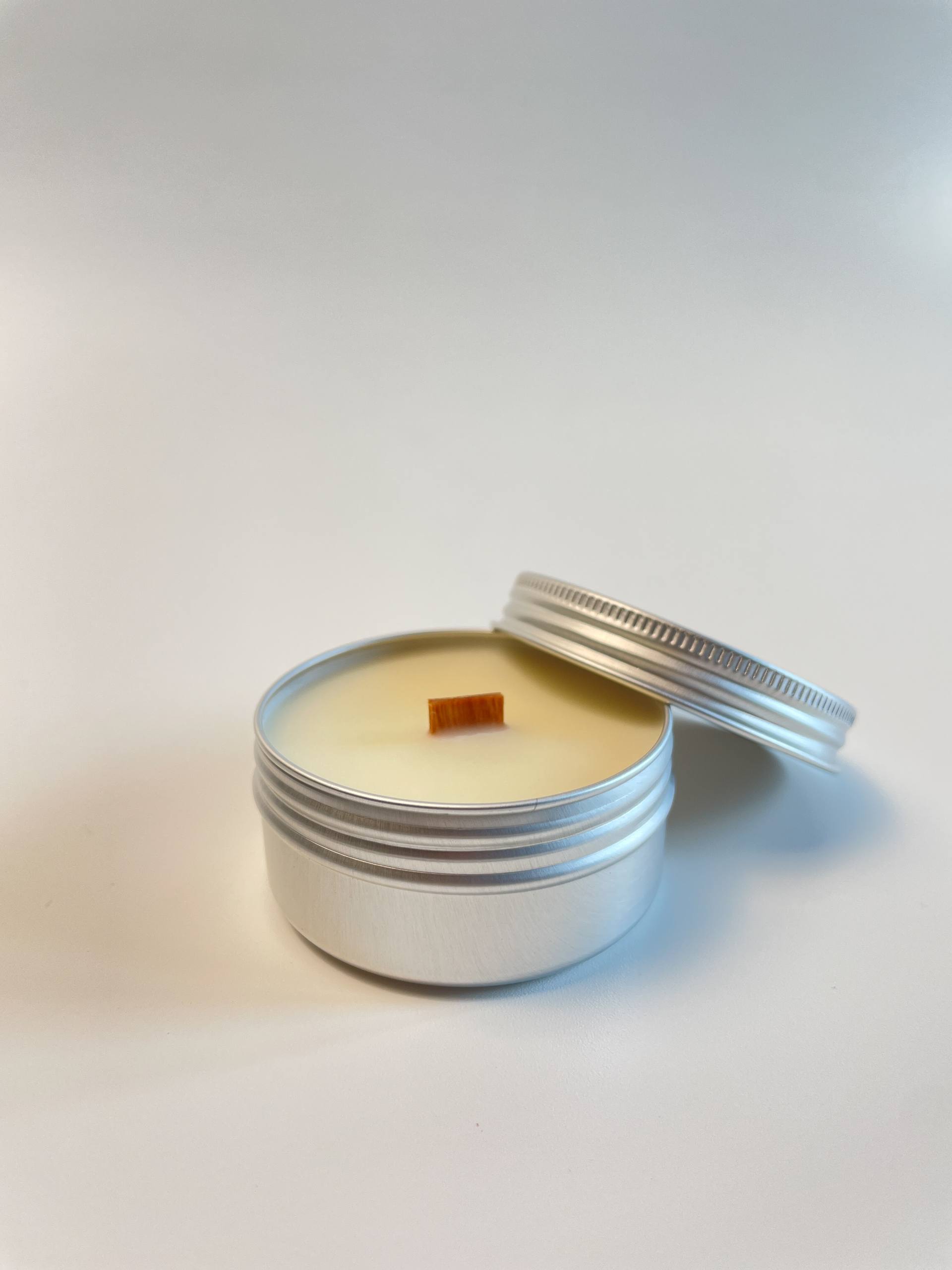 Баночка из алюминия, деревянный сдвоенный фитиль из американской вишни, премиальная ароматическая композиция из США и натуральный соевый воск из Швеции объемом 50 мл.